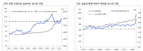 그는 "코스피는 12개월 선행 주가수익비율(PER) 11배 내외의 낮은 밸류에이션 환경 속에서 실적주도 상승 국면이 지속되고 있다"며 "반면 코스닥은 이익 개선보다는 지수 상승 과정에서 PER이 함께 확대되는 흐름이 관찰되며, 지수 차원의 펀더멘털 개선은 제한적인 모습"이라고 지적했다.
