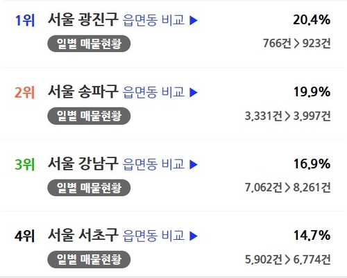 강남구는 8천261건의 매물이 나와 지난달의 7천62건에 비해 16.9% 증가했다. 송파구는 한 달 전 3천331건에서 현재 3천997건으로 19.9% 늘어 매물 증가율 상위권을 차지했다.