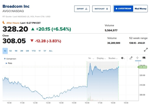 알파벳의 공격적인 AI 인프라 확장이 반도체 칩 수요 증가로 이어질 것이란 기대감에 브로드컴은 시간외 거래에서 정규장 대비 20.15달러(6.54%) 오른 328.20달러에 거래됐다.
