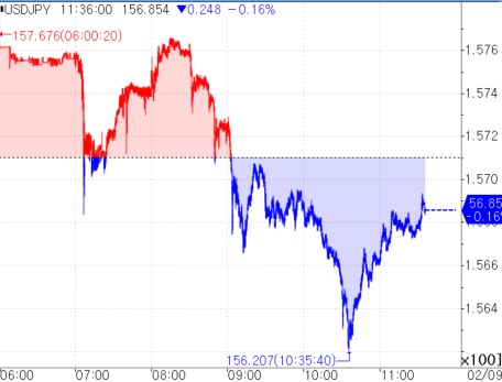 전일 자민당은 중의원선거에서 전체 의석의 3분의 2이상을 확보하는 압승을 거뒀다. 이에 엔화가 약세 압력을 받으며 달러-엔 환율은 이른 아침 157.676엔까지 올랐다. 그러나 이후 오전 9시께 하락반전한뒤 장중 157엔선 밑으로 밀렸다.