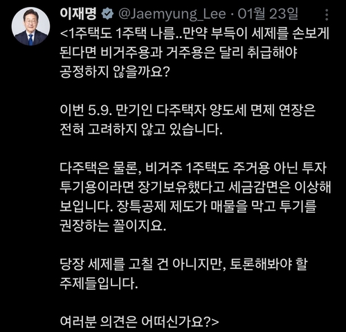 18일 업계에 따르면 이 대통령은 지난달 소셜미디어 엑스(X·전 트위터)를 통해 "이번 5.9 만기인 다주택자 양도세 면제 연장은 전혀 고려하고 있지 않다"면서 "다주택은 물론, 비거주 1주택도 주거용 아닌 투자 투기용이라면 장기 보유했다고 세금 감면은 이상해 보인다"며 중과세 유예의 끝을 알렸다.
