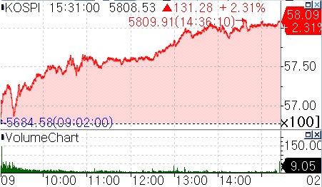 20일 연합인포맥스 신주식종합(화면번호 3536)에 따르면 코스피가 전 거래일보다 131.28포인트(2.31%) 상승한 5,808.53으로 거래를 마감했다. 지수는 장초반에 소폭 상승하다가 꾸준히 오르막을 걸으며 5,700선과 5,800선을 연이어 돌파했다. 사상 처음으로 5,000선을 넘어선 지 1개월도 채 되지 않은 시점에 800포인트 더 오른 것이다.