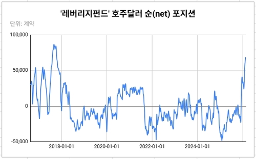 달러 약세로 투기 세력의 베팅이 쏠려 있음을 단적으로 보여주는 것은 호주달러에 대한 롱 포지션이다. CFTC에 따르면 지난 17일로 끝난 주간에 레버리지펀드의 호주달러 순포지션은 플러스(+) 6만8천641계약으로 집계됐다.