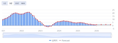 S&P 코어로직 케이스-실러 전미주택가격지수 상승률에서도 비슷한 모습이 포착됐다. 팬데믹 동안 전년 동기 대비(YoY) 두 자릿수 성장률을 월마다 기록할 정도였다.