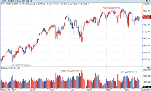 연합인포맥스 지수선물 통합화면(화면번호 6520)에 따르면 한국 시각으로 오전 10시1분 기준 E-미니 S&P500 지수 선물은 전장 대비 0.07%% 오른 6,908.25에 거래됐다.