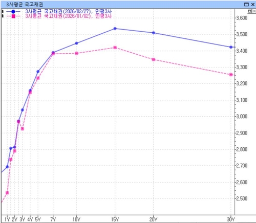 3일 채권시장에 따르면 국고채 30년물 민평금리는 전 거래일 3.422%로 3.445%인 10년물 금리를 2.3bp가량 밑돈다.