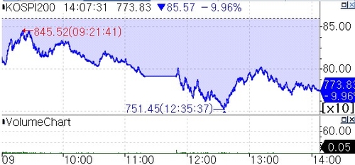 (서울=연합인포맥스) 송하린 기자 = 코스피200이 이날에도 10% 가까이 급락하면서, 국내 선물옵션의 장중 추가증거금 사유가 발생했다.