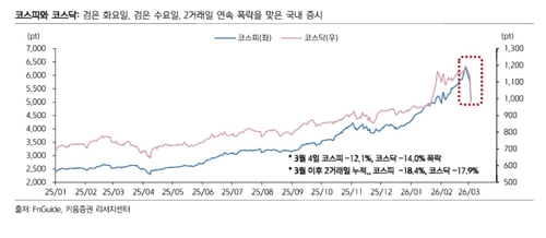 키움증권은 중동 지정학적 리스크와 인공지능(AI) 불안, 사모대출 위기론 등으로만 코스피 낙폭을 설명하기는 어렵다고 진단했다. 그동안 급격한 상승세를 보여온 만큼 조정의 폭이 컸다는 해석이다.
