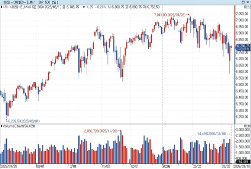 연합인포맥스 지수선물 통합화면(화면번호 6520)에 따르면 한국 시각으로 오전 9시 41분 기준 E-미니 S&P500 지수 선물은 전장 대비 0.21% 하락한 6,786.75에 거래됐다.