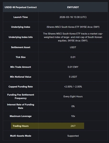13일 업계에 따르면 바이낸스는 오는 16일부터 'EWYUSDT' 인덱스 무기한선물(영구선물·Perpetual)을 상장한다.