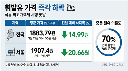 실제로 이날 오전 10시56분 오피넷에 고지된 전국 평균 휘발유 가격은 리터당 1883.79원으로 전일 대비 14.99원 내렸다. 서울 주유소 평균가는 전일 대비 20.66원 떨어진 1907.40원으로 집계됐다.