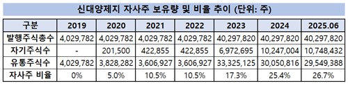 지난 6일 자사주 소각 의무화를 골자로 하는 3차 상법 개정안이 시행된 데 따른 것이다. 신대양제지는 지난 2020년부터 자사주를 사들이기 시작해 5년여 만에 전체 주식의 26.7%까지 비중을 끌어올렸다.