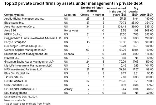 프레킨에 따르면 2024년 말 기준 사모신용 펀드 운용자산(AUM)을 기준으로 아폴로 글로벌 매니지먼트가 AUM 4천800억달러로 가장 운용 규모가 컸고, 블랙스톤(3천547억달러)과 아레스 매니지먼트(3천353억달러)가 뒤를 이었다.