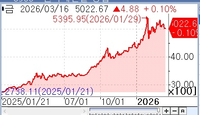 16일 연합인포맥스 원자재 선물 종합(화면번호 6900)에 따르면 금 현물 가격은 개장 초 1% 넘게 하락하며 5천달러 이하로 하락했다. 그러나 오전 9시9분 현재 상승반전하며 전장보다 0.1% 오른 5,022.67달러에 거래됐다.