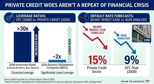 최악의 경우 사모신용 부도율이 15%에 달할 것이라는 비관론에 대해 BofA는 "경제 성장률이 마이너스였고 자산 운용사의 질이 훨씬 낮았던 2008년 당시에도 부도율은 9% 수준이었다"며 현재 시장의 공포가 실질적인 경제 여건에 비해 과도하게 부풀려져 있다"고 지적했다.