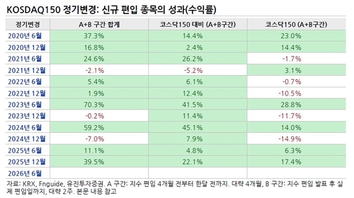 특히 코스닥150의 경우, 2020년 이후 작년까지 총 12번의 정기 변경 중 지수 편입 4개월 전부터 실제 편입일까지의 구간에서 신규 편입 종목의 주가가 하락한 것은 3번(2021년 12월, 2023년 12월, 2024년 12월)뿐이었다. 주가 하락 폭도 -5% 미만이나 내외로 크지 않았다.