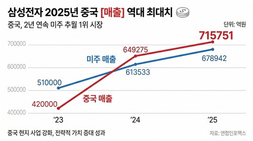 중국은 삼성전자가 지난해 가장 많은 매출을 올린 지역이다. 전체 매출(별도 기준)의 30%를 중국에서 벌어들였다. 2024년에 이어 2년 연속 1위를 기록했다. 이는 회사의 성장을 위해 반드시 신경을 써야 하는 시장이라는 뜻이다.