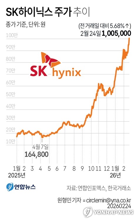 (서울=연합뉴스) 원형민 기자 = 24일 한국거래소에 따르면 SK하이닉스[000660]는 전장 대비 5.68% 오른 100만5천원에 거래를 마쳤다. circlemin@yna.co.kr