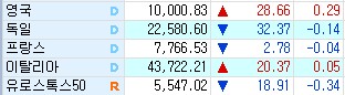 프랑스 CAC40 지수는 0.04% 내린 7,766.53, 이탈리아 FTSE MIB 지수는 0.05% 오른 43,722.21을 각각 보였다.