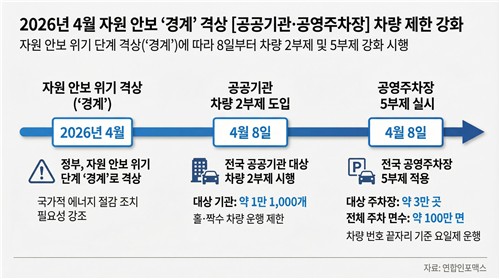 (서울=연합인포맥스) 유수진 기자 = 정부가 8일부터 공공기관 승용차 2부제(홀짝제)와 공공기관이 운영하는 공영주차장에서 승용차 5부제(요일제)를 실시한다.