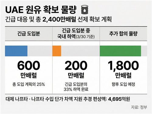 글로벌 에너지 위기 속에서 아랍에미리트(UAE)는 한국의 가장 믿음직한 우군으로 등판했다. 정부는 특사단 파견 등을 통해 UAE로부터 총 2천400만배럴의 원유를 선제적으로 확보했다. 긴급 도입분 600만배럴 중 200만배럴은 지난달 30일 국내 하역을 시작했고, 잔여 물량도 이달 중순 입고될 예정이다. 추가 합의된 1천800만배럴 역시 순조롭게 도입될 전망이다.