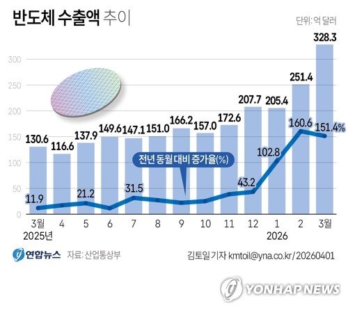 (서울=연합뉴스) 김토일 원형민 기자 = 산업통상부가 1일 발표한 '3월 수출입 동향'에 따르면 지난달 반도체 수출액은 전년 동월 대비 151.4% 폭증한 328억3천만달러를 기록했다. circlemin@yna.co.kr