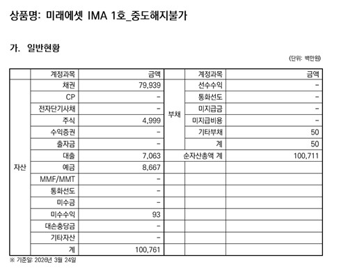 IMA 관련 규정에 따르면, 사업자는 시행세칙에 따라 3개월마다 종합투자계좌의 자산운용 현황을 공시해야 한다. 이에 따라 지난 12월 결성된 첫 상품의 운용 현황이 공개됐다.