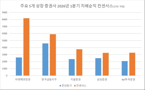 6일 연합인포맥스 컨센서스 종합(화면번호 8031)에 따르면 최근 3개월간 증권사들이 전망한 미래에셋증권, 한국금융지주, 키움증권, 삼성증권, NH투자증권 등 5개 대형 상장 증권사의 올해 1분기 지배순익 총합은 2조4천345억원으로 집계됐다.