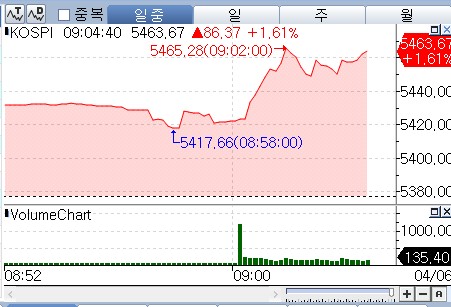 6일 연합인포맥스 신주식종합(화면번호 3536)에 따르면 오전 9시 4분 기준 코스피는 전 거래일보다 86.37포인트(1.61%) 상승한 5,463.67에서 거래되고 있다.