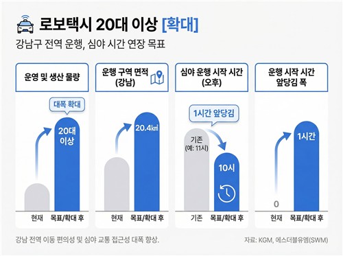 서비스의 외연도 한층 확장한다. KGM은 로보택시 생산 물량을 올해 연말까지 20대 이상으로 늘릴 계획이다. 운행 구역은 기존 강남구와 서초구 일부에서 자율주행 시범운행지구인 강남 전역(20.4㎢)으로 넓어진다. 심야 시간대 이동 편의를 위해 운행 시작 시간도 오후 10시로 1시간 앞당겼다.