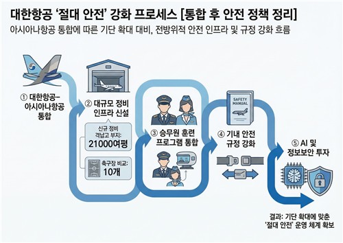 대한항공은 안전 운항을 위해 항공기 정비 기반 시설을 확충하고 대한항공과 아시아나항공 운항승무원의 정기 훈련 프로그램을 선제적으로 통합했다.
