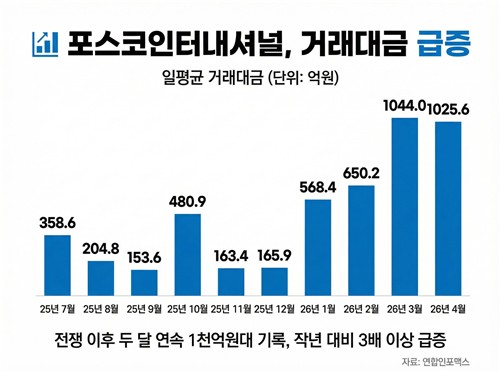 8일 연합인포맥스 주식 종목별 일별 추이(화면번호 3121)에 따르면 포스코인터내셔널의 전일까지 이달 일평균 거래대금은 1천2억5천만원대로 집계됐다. 전월에 이어 두 달째 하루 평균 1천억원의 매매가 오가고 있다. 작년 연간 수치(328억1천700만원)와 비교하면 세 배가 넘는 수준이다. 전쟁 이후 투자자들이 대거 유입된 결과다.