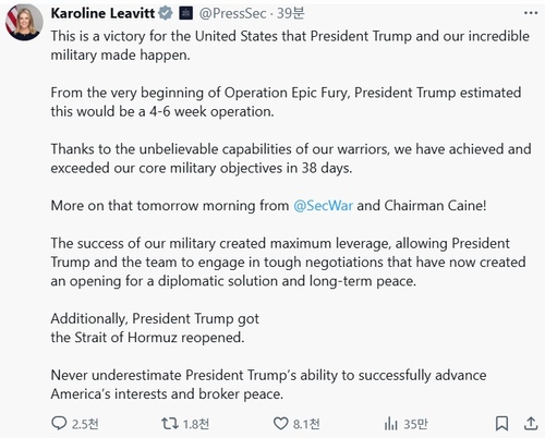 캐롤라인 레빗 백악관 대변인은 이날 자신의 엑스(옛 트위터) 계정에 "이것은 트럼프 대통령과 우리의 놀라운 군대가 이뤄낸 미국의 승리"라고 적었다.
