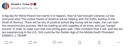 그는 "이란은 재건 과정을 시작할 수 있을 것"이라며 "우리는 온갖 물자를 공급하고, 모든 일이 순조롭게 진행될 수 있도록 주변에 머물겠다"고 덧붙였다.
