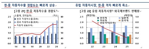 이 과장은 "중국의 글로벌 진출이 확대되면서 우리나라 자동차와 중국 자동차와의 수출 경합도는 2020년 이후 매우 빠르게 높아졌다"며 "주력시장 중 하나인 유럽시장에서 우리나라와 중국 간의 점유율 격차도 빠르게 축소되고 있다"고 말했다.