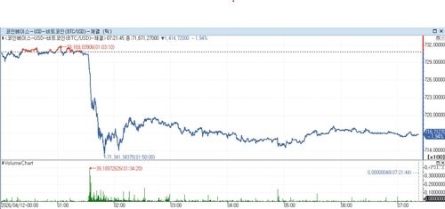 12일 연합인포맥스에 따르면, 비트코인 가격은 전날보다 1.94% 하락한 71,671달러에 거래됐다.