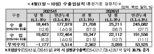 (세종=연합인포맥스) 박준형 기자 = 올해 4월 1일부터 10일까지 수출이 전년 동기 대비 36.7% 증가한 것으로 나타났다.