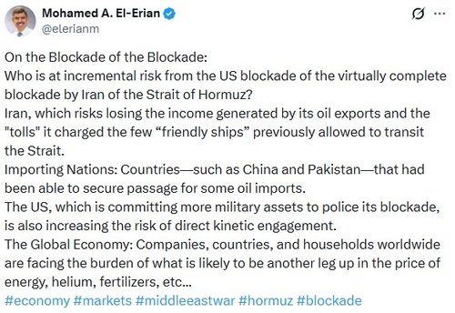 (서울=연합인포맥스) 홍경표 기자 = 모하메드 엘-에리언 알리안츠 수석 경제자문은 도널드 트럼프 미국 대통령의 호르무즈 봉쇄로 중동 충돌 위험이 증가했다고 평가했다.