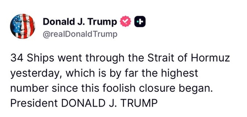 (뉴욕=연합인포맥스) 최진우 특파원 = 도널드 트럼프 미국 대통령은 13일(현지시간) "어제 호르무즈 해협을 통과한 선박은 총 34척으로, 이 어리석은 봉쇄 사태가 시작된 이래 단연코 가장 많은 수치"라고 밝혔다.