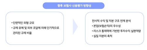 김 연구원은 "향후 보험 손익의 우수성, 리스크 통제에 기반한 투자수익 실현 역량, 실질 자본 축적이 보험사 신용평가의 방향성이 될 것"이라며 "이런 구조를 갖춘 보험사는 거시경제 변동성 확대에도 우수한 신용도와 시장지위를 유지할 것"이라고 말했다.