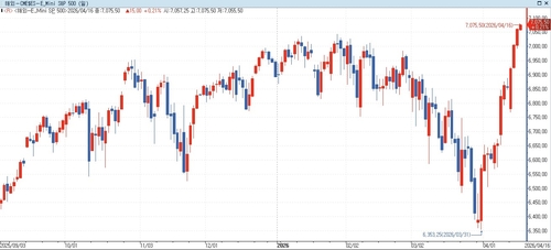 연합인포맥스 지수선물 통합화면(화면번호 6520)에 따르면 한국 시각으로 오전 9시50분 기준 E-미니 S&P500 지수 선물은 전장 대비 0.21% 상승한 7,075.50에 거래됐다.