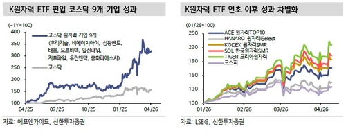 박우열 신한투자증권 연구원은 16일 보고서에서 "K원자력 ETF는 액티브를 표방하지 않음에도 상품별 편입 종목 구성과 편입비에 많은 차이가 있다"며 "연초 이후 성과도 45% 수준에서 126%까지 편차가 컸다"고 밝혔다.