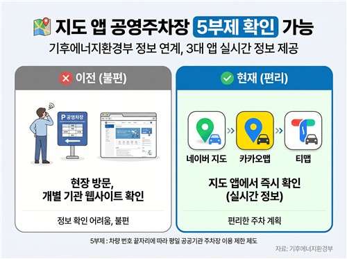 (세종=연합인포맥스) 이재헌 기자 = 네이버지도와 카카오맵, 티맵 등 지도 애플리케이션을 통해 공영주차장의 승용차 5부제 시행 여부를 확인할 수 있다고 기후에너지환경부가 17일 밝혔다.