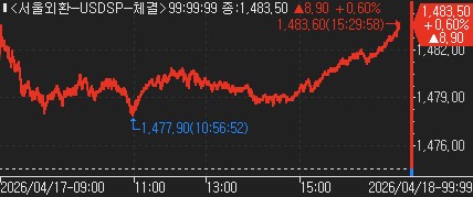 장중 고점은 1,483.60원, 저점은 1,477.90원으로 장중 변동 폭은 5.70원이다.