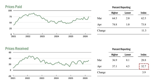 수취 가격(prices received) 지수는 이달 32.7을 나타내며 지난 2023년 3월 이후 최고 수준으로 치솟았다. 기업의 지급 가격(prices paid)이 지난 2022년 11월 이후 최고치로 오른 가운데 수취가격도 꿈틀대는 격이다.