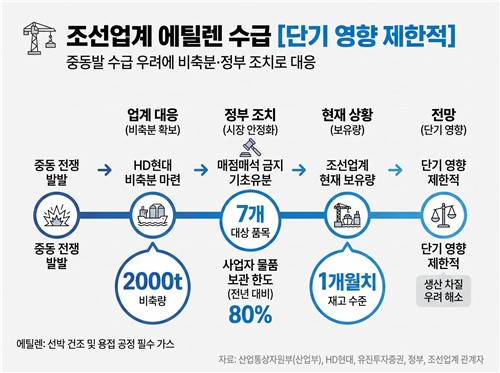 조선업계 관계자는 "현재까지는 에틸렌 보유량이 한 달 치 정도 남아 있어 단기적으로는 문제가 없다"면서도 "전쟁이 장기화할 경우를 대비해 모니터링 중"이라고 했다.