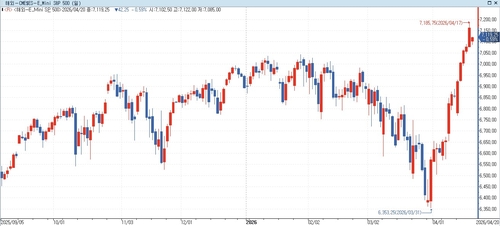 연합인포맥스 지수선물 통합화면(화면번호 6520)에 따르면 한국 시각으로 오전 10시17분 기준 E-미니 S&P500 지수 선물은 전장 대비 0.59% 하락한 7,119.25에 거래됐다.