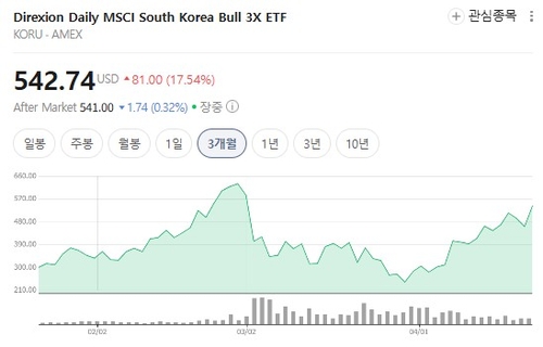 코스피를 세 배 추종하는 미국 상장 ETF 코루(KORU)는 간밤 17.54% 급등했다