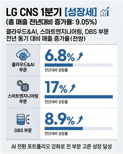 (서울=연합인포맥스) 한종화 기자 = LG씨엔에스[064400]가 인공지능(AI) 전환(AX)에 적합한 사업 포트폴리오에 힘입어 1분기 영업이익이 전년 대비 약 20% 증가할 것으로 전망됐다.