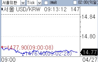 27일 서울 외환시장에서 달러-원 환율은 오전 9시 11분 현재 전일대비 7.60원 하락한 1,476.90원에 거래되고 있다.